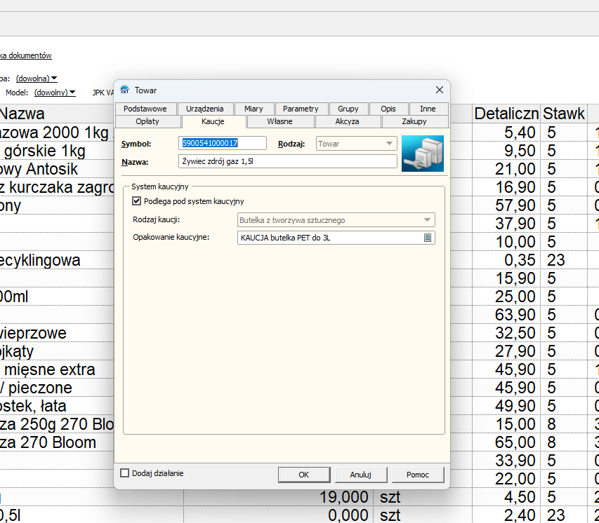 2. W towarach, module kaucje zaznaczyłem, że podlega pod system kaucyjny z przypisaniem do danego opakowania (Zrzut 2)